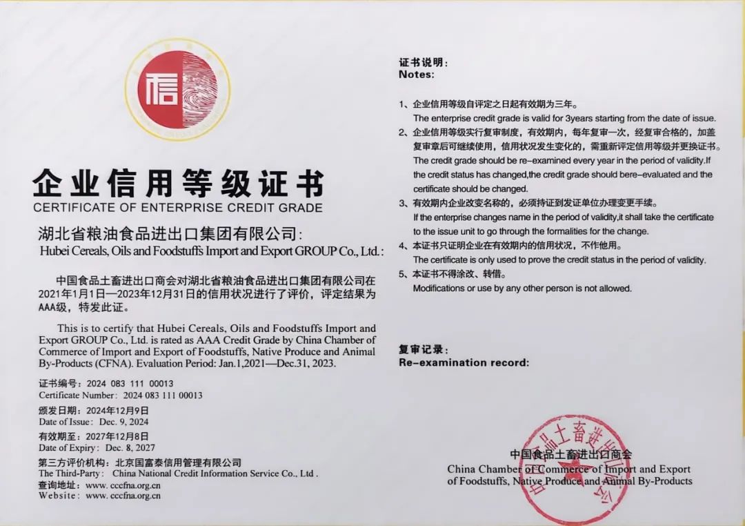作爲湖北省曆史最爲悠久的進出口企業之一,省糧油進出口集團自1949年成立以來,持續發揮省級農業龍頭示範引領帶動作用。本次獲評兩項榮譽,不僅标志着行業内對省糧油進出口集團在對外貿易領域突出貢獻的高度認可,更是公司争做誠信經營建設倡導者、實踐者并積極踐行社會責任的有力見證。